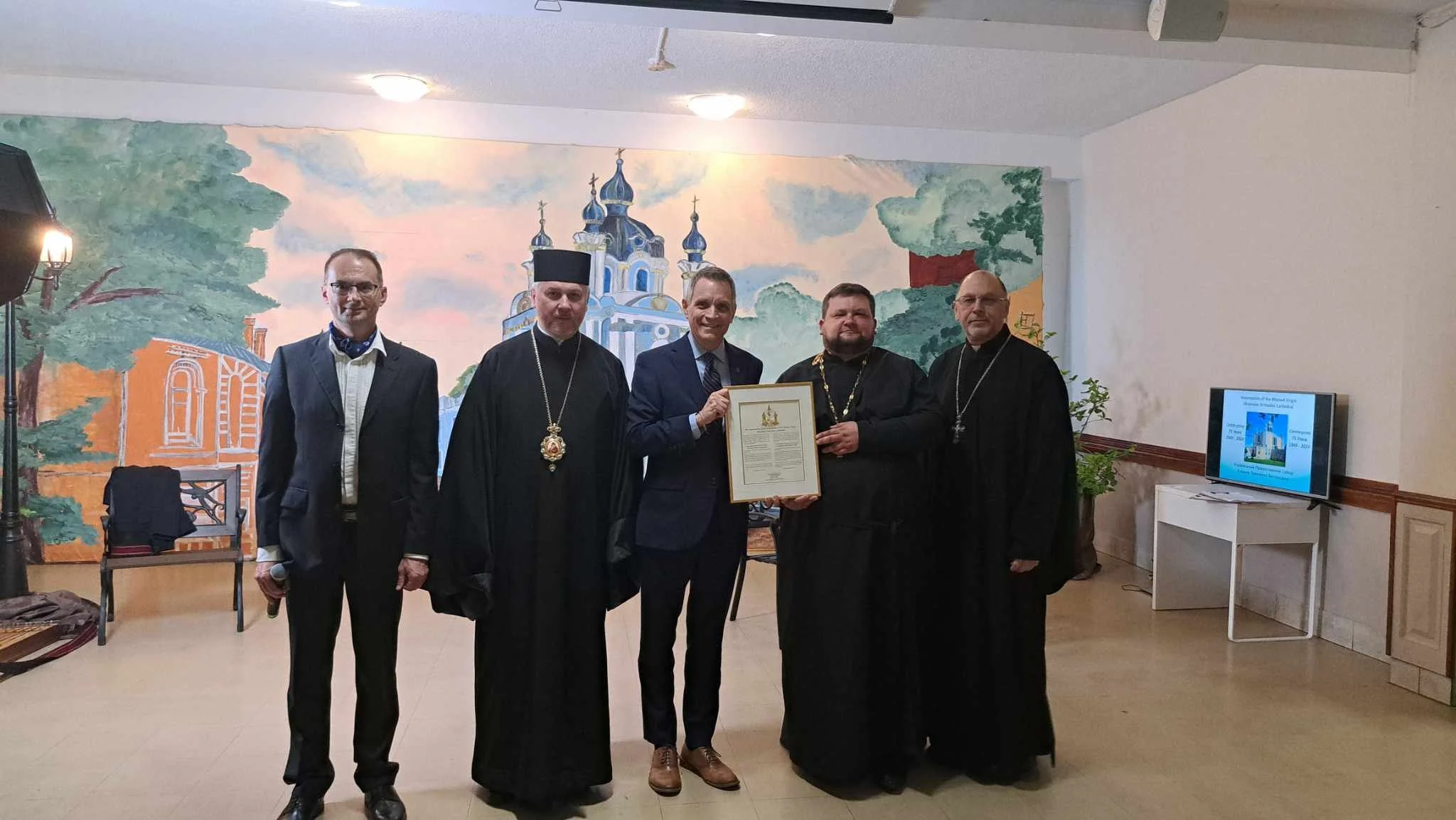 Throughout the evening, greetings were offered by Bishop Andriy; Father Dr. Yaroslav Buciora, Dean of St. Volodymyr’s Cathedral in Toronto; Andrii Bukvych, Minister-Counsellor of the Embassy of Ukraine to Canada; our Parish President Viktor Stetskevych; and Father Taras Kinash, Dean of our Cathedral. Messages of congratulations were also received from His Eminence Metropolitan Ilarion, Primate of the Ukrainian Orthodox Church of Canada, and from the Honourable Chrystia Freeland, Deputy Prime Minister and Minister of Finance of Canada. A particularly moving moment came with the presentation of a Blessed Certificate to Mrs. Doreen Keir, our most generous benefactor, in recognition of her invaluable contributions to the Church Renovation Fund.